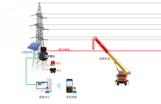 天河電子基于激光雷達(dá)的架空輸電線路防護(hù)系統(tǒng),旨在彌補(bǔ)視頻監(jiān)控技術(shù)、傳感器報(bào)警技術(shù)被動(dòng)防御的特性和智能圖像分析技術(shù)在環(huán)境應(yīng)用中的局限性,利用激光雷達(dá)主動(dòng)防御的特性,結(jié)合高清視頻監(jiān)控技術(shù),對(duì)闖入電力高壓線下3-5米目標(biāo)(如違章作業(yè)吊車)進(jìn)行定位、跟蹤、放大,現(xiàn)場(chǎng)警示違章作業(yè)人員,同時(shí)上傳告警視頻或圖片給監(jiān)管單位進(jìn)行相應(yīng)警情處置。