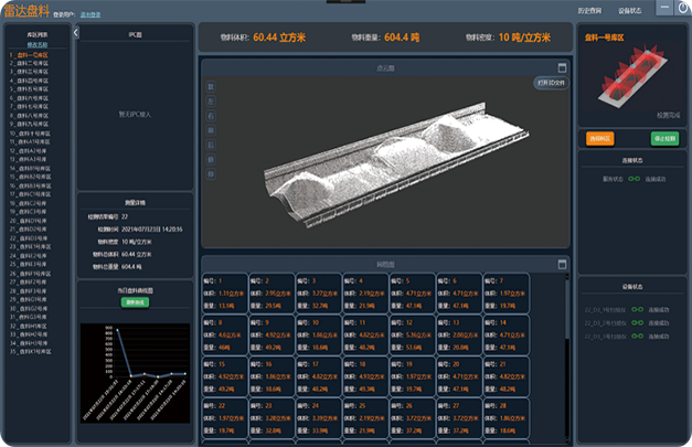 智能料倉盤庫系統(tǒng)主要由前端設(shè)備、傳輸通道及監(jiān)控中心三部分組成。前端設(shè)備主要由數(shù)據(jù)處理單元、激光檢測器等組成,激光檢測器接收系統(tǒng)指令對(duì)料堆進(jìn)行掃描,并將掃描數(shù)據(jù)上傳至數(shù)據(jù)處理主機(jī),數(shù)據(jù)處理主機(jī)對(duì)上傳的掃描數(shù)據(jù)進(jìn)行處理,最終生成料堆的三維模型,并將其獲得的三維模型數(shù)據(jù)上傳至監(jiān)控中心進(jìn)行處理、存儲(chǔ)。